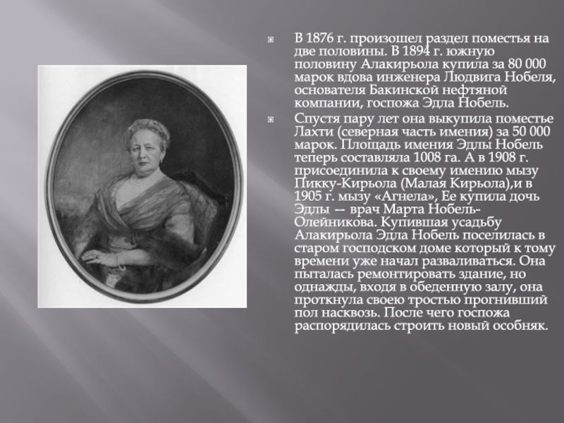 Спустя пару лет она выкупила поместье Лахти (северная часть имения) за 50 000 марок. Площадь имения Эдлы Нобель теперь составляла 1008 га. А в 1908 г. присоединила к своему имению мызу Пикку-Кирьола (Малая Кирьола),и в 1905 г. мызу «Агнела», Ее купила дочь Эдлы — врач Марта Нобель-Олейникова. Купившая усадьбу Алакирьола Эдла Нобель поселилась в старом господском доме который к тому времени уже начал разваливаться. Она пыталась ремонтировать здание, но однажды, входя в обеденную залу, она проткнула своею тростью прогнивший пол насквозь. После чего госпожа распорядилась строить новый особняк.