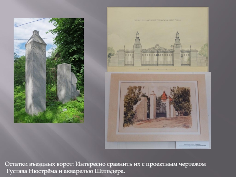 Слайд 17Остатки въездных ворот: Интересно сравнить их с проектным чертежом