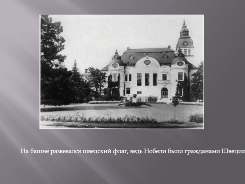 Слайд 7На башне развевался шведский флаг, ведь Нобели были гражданами Швеции.
