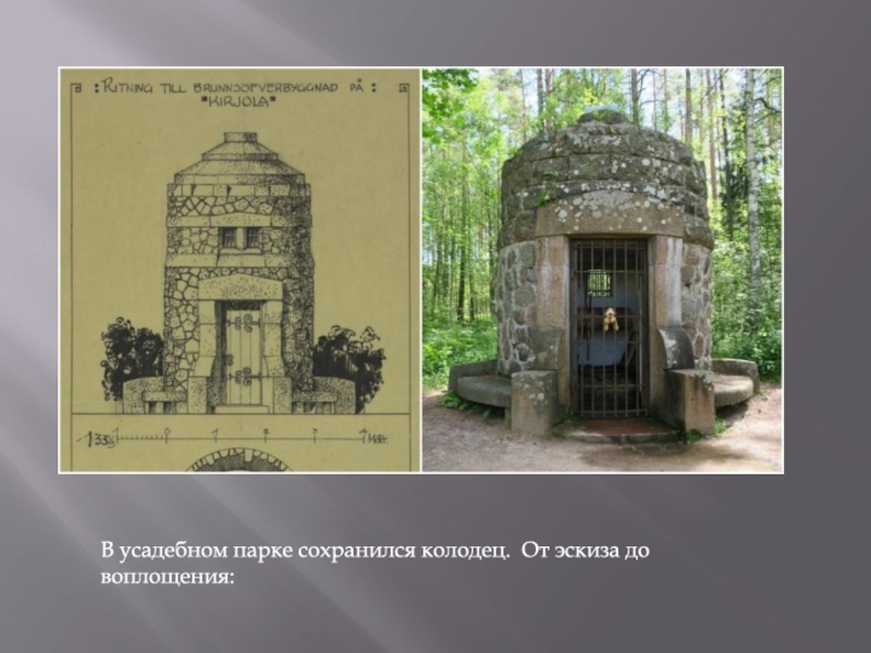 Слайд 16В усадебном парке сохранился колодец. От эскиза до воплощения: