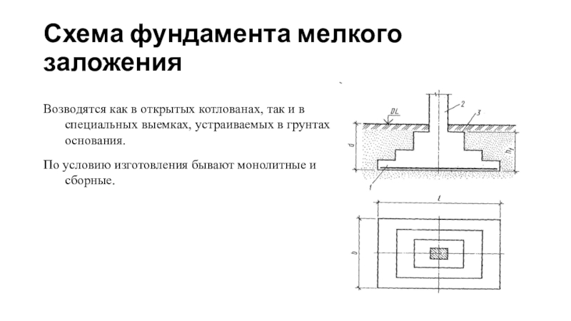 Схема фундамента мелкого заложенияВозводятся как в открытых котлованах, так и в специальных выемках, устраиваемых в грунтах основания.