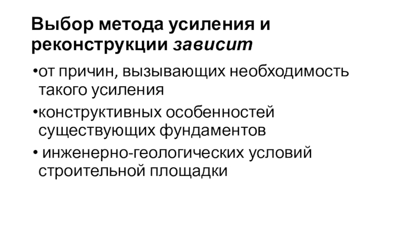 Выбор метода усиления и реконструкции зависитот причин, вызывающих необходимость такого усиленияконструктивных особенностей существующих фундаментов инженерно-геологических условий строительной