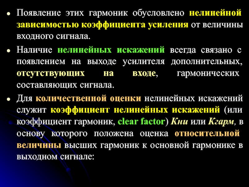 Слайд 14Появление этих гармоник обусловлено нелинейной зависимостью коэффициента усиления от величины
