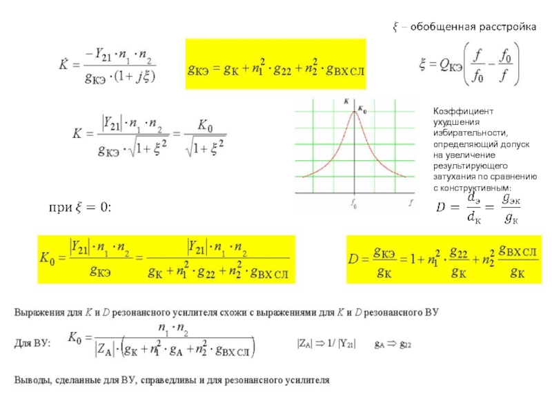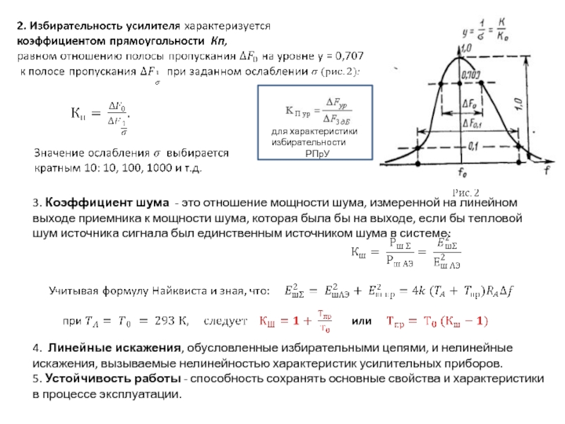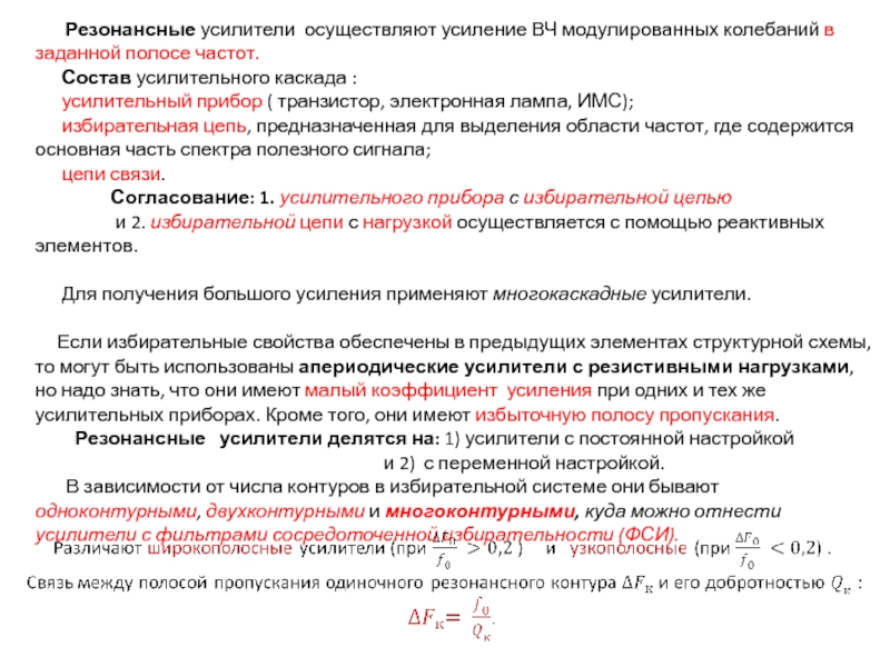 3. Частотная избирательность (селективность) - усиление ВЧ модулированных колебаний в заданной полосе частот, поэтому усилители содержат резонансные нагрузки или частотно-избирательные элементы каскадной связи.