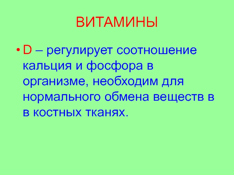 Слайд 17D – регулирует соотношение кальция и фосфора в организме, необходим