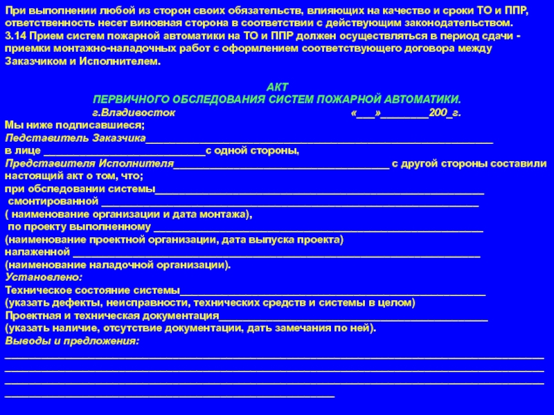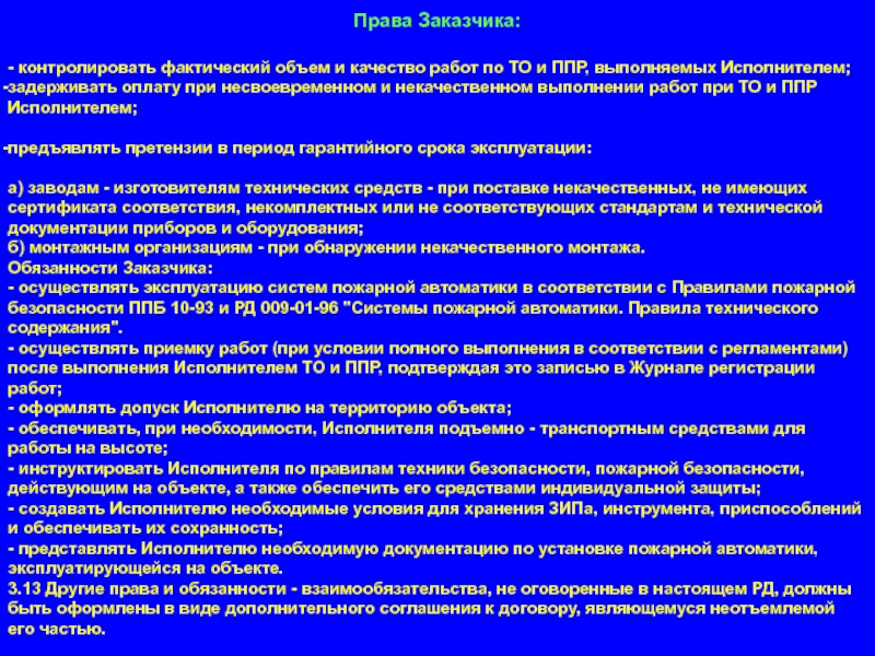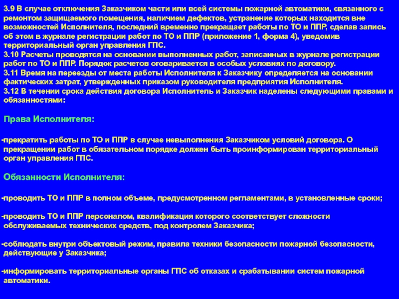 прекратить работы по ТО и ППР в случае невыполнения Заказчиком условий договора. О прекращении работ в обязательном порядке должен быть проинформирован территориальный орган управления ГПС.