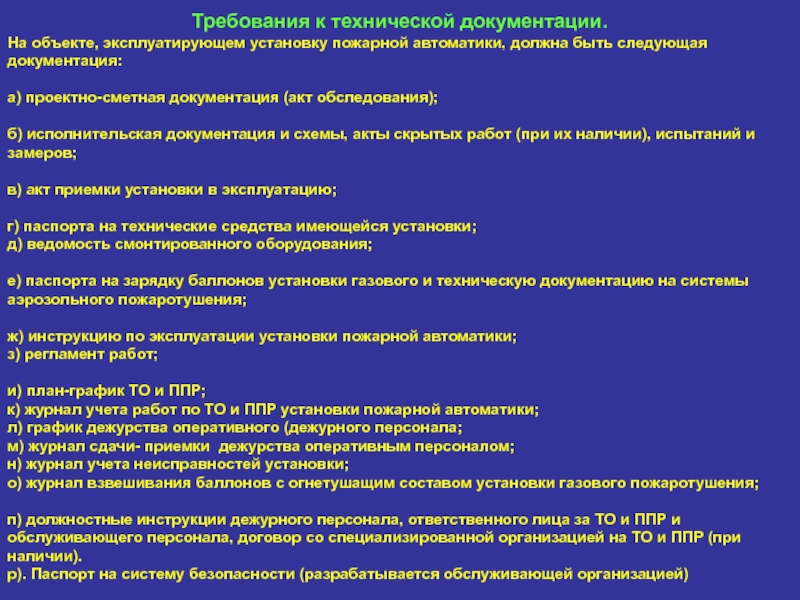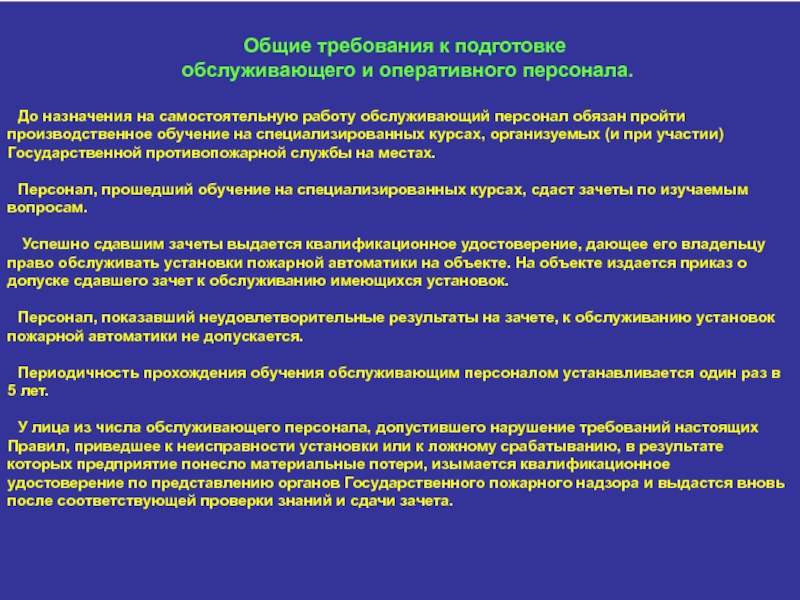 Обслуживающий персонал объекта или представитель специализированной организации обязаны знать устройствои принцип работы установки пожарной автоматики на объекте, знать и выполнять требования настоящих Правил, Инструкции по эксплуатации этой установки.