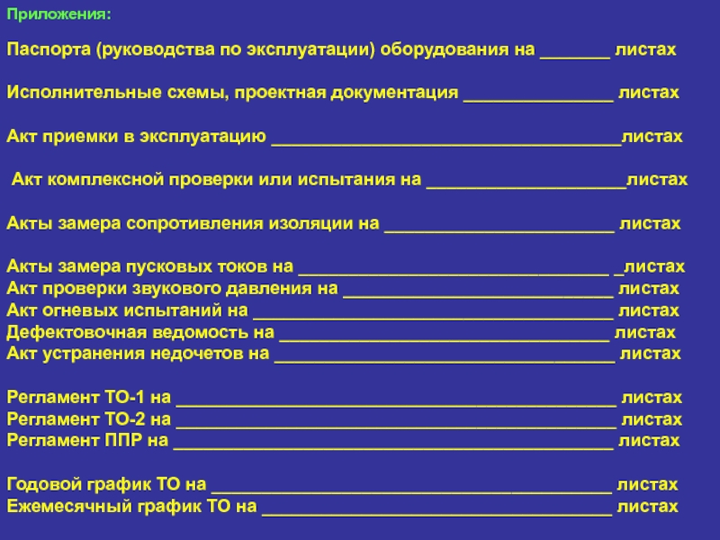 п) должностные инструкции дежурного персонала, ответственного лица за ТО и ППР и обслуживающего персонала, договор со специализированной организацией на ТО и ППР (при наличии).