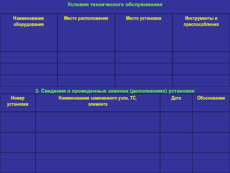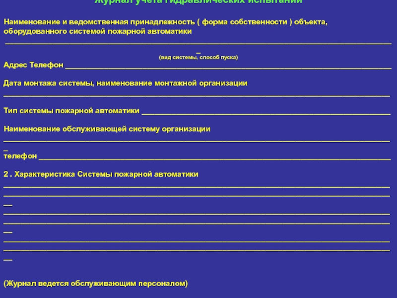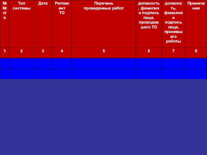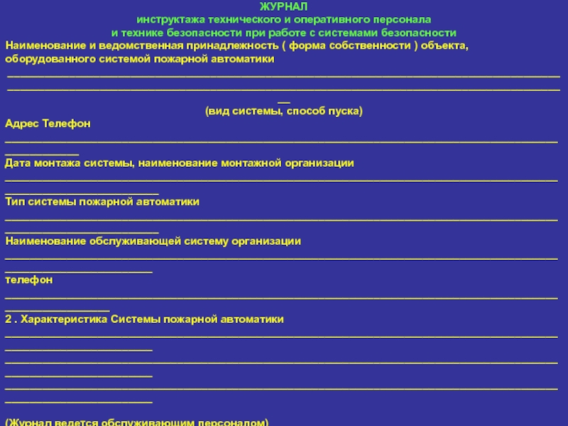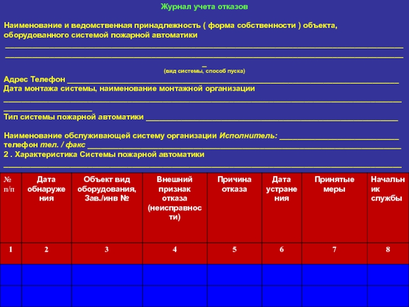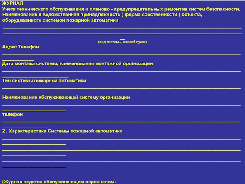 Обслуживающий персонал объекта или представитель обслуживающей организации, осуществляющие ТО и ППР установок пожарной автоматики, должны производить регламентные работы в установленные сроки и вести соответствующую эксплуатационную документацию, приведенную в приложениях к настоящим Правилам.