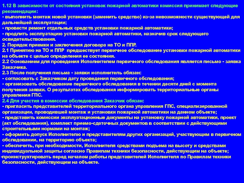 Слайд 41.12 В зависимости от состояния установок пожарной автоматики комиссия принимает