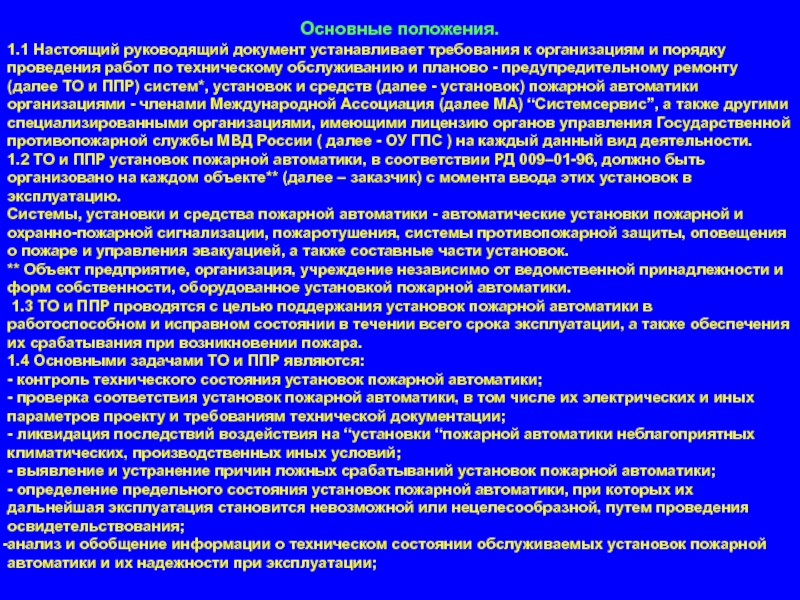 1.2 ТО и ППР установок пожарной автоматики, в соответствии РД 009–01-96, должно быть организовано на каждом объекте** (далее – заказчик) с момента ввода этих установок в эксплуатацию.