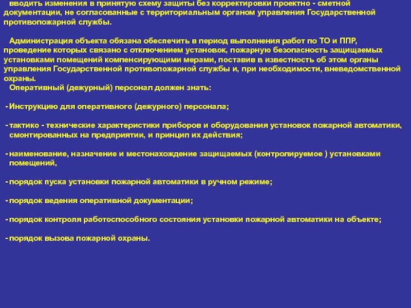 Администрация объекта обязана обеспечить в период выполнения работ по ТО и ППР, проведение которых связано с отключением установок, пожарную безопасность защищаемых установками помещений компенсирующими мерами, поставив в известность об этом органы управления Государственной противопожарной службы и, при необходимости, вневедомственной охраны.
