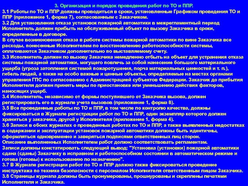 3.2 Для установления отказа установок пожарной автоматики в межрегламентный период Исполнитель должен прибыть на обслуживаемый объект по вызову Заказчика в сроки, определенные в договоре.