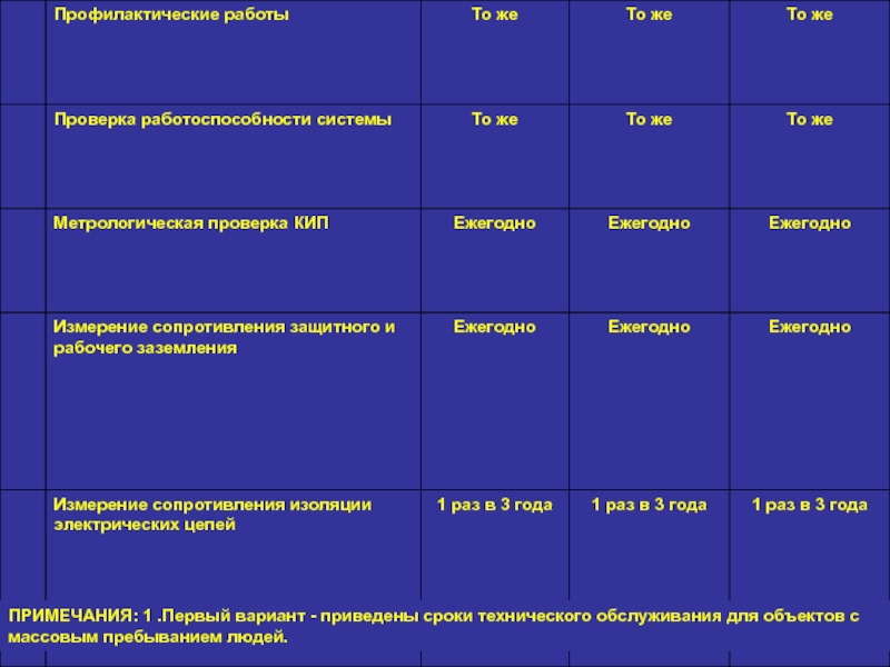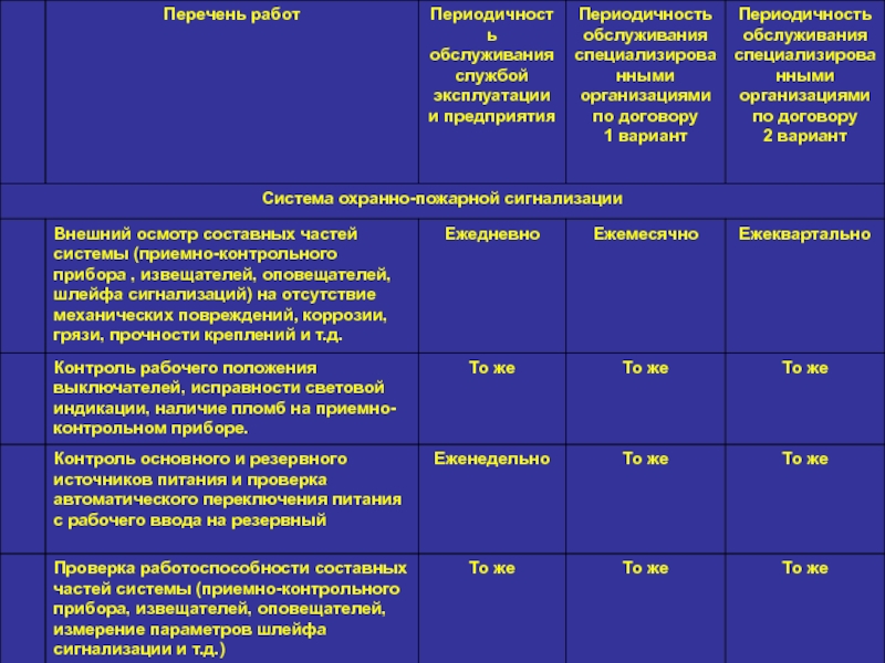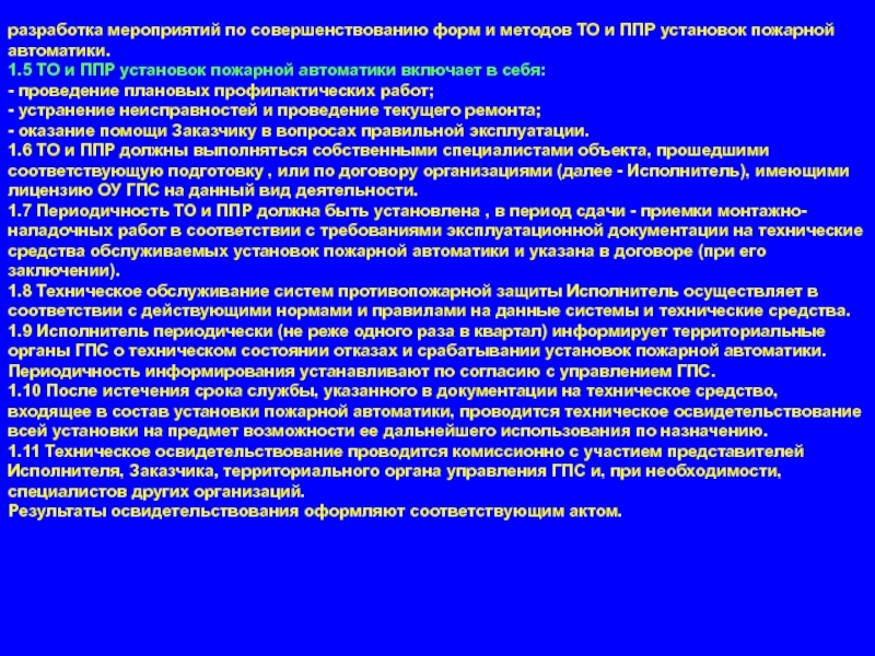 1.7 Периодичность ТО и ППР должна быть установлена , в период сдачи - приемки монтажно-наладочных работ в соответствии с требованиями эксплуатационной документации на технические средства обслуживаемых установок пожарной автоматики и указана в договоре (при его заключении).
