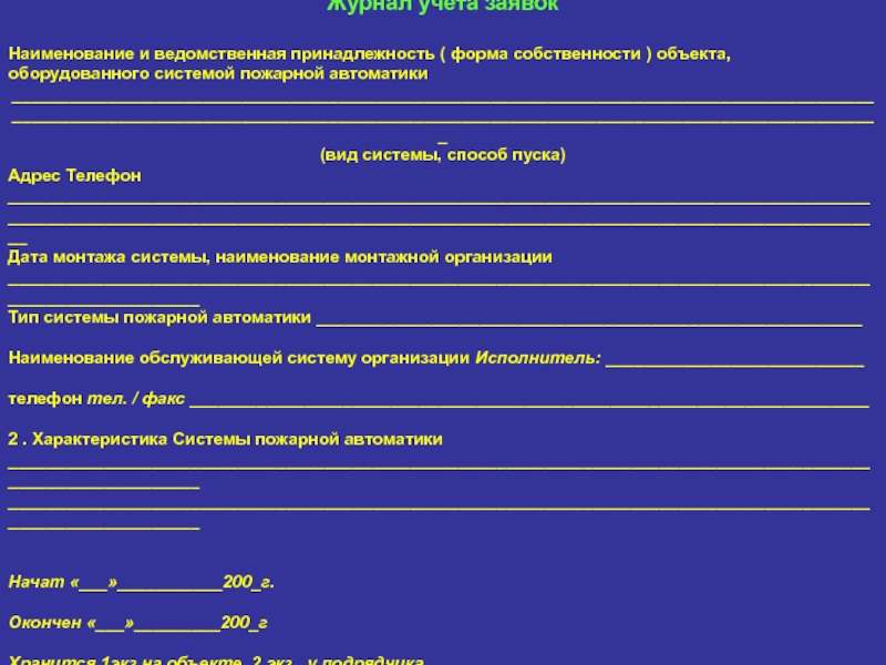 2.10 После заключения договора на ТО и ППР Исполнитель заполняет паспорт установки пожарной автоматики (приложение 1, форма 3), оформляет в 2 экземплярах. Журнал регистрации работ на ТО и ППР (приложение 1, форма 4). График проведения ТО и ППР (приложение 1, форма 5). Технические параметры работоспособности установки пожарной автоматики (приложение 1, форма 6).