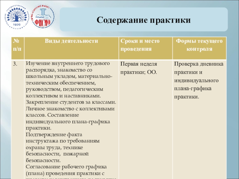 3) Индивидуальный рабочий график (план) практики студента, составленный по