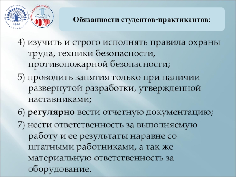7) нести ответственность за выполняемую работу и ее результаты наравне со штатными работниками, а так же материальную ответственность за оборудование.