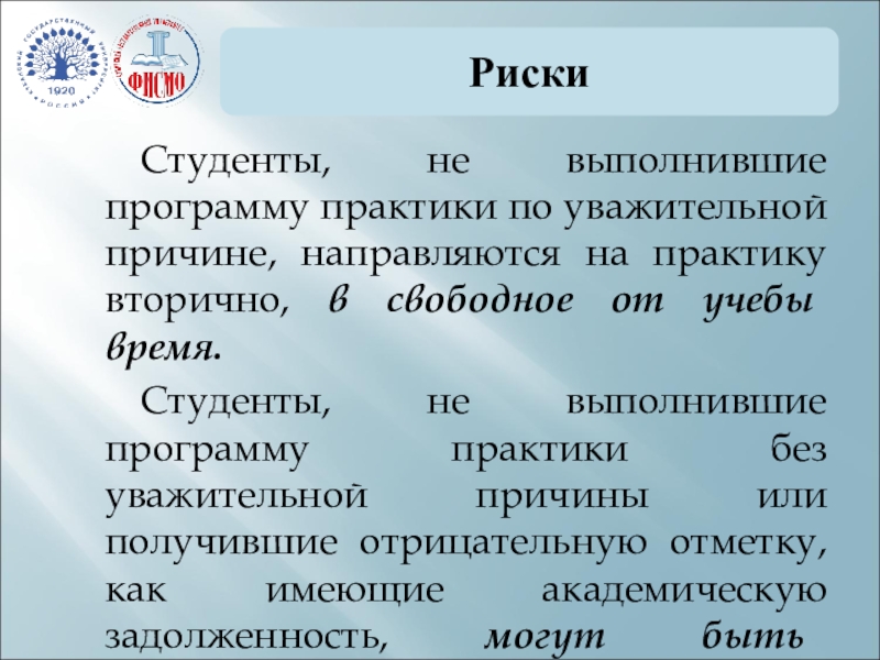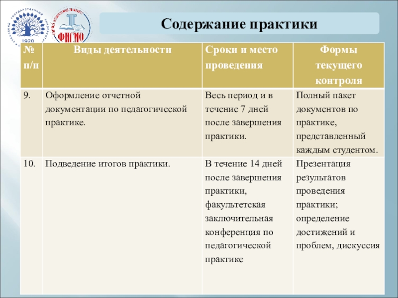 итоговая конференция - не позднее 14 дней после завершения практики (дата, время, аудитория проведения будут сообщены дополнительно)