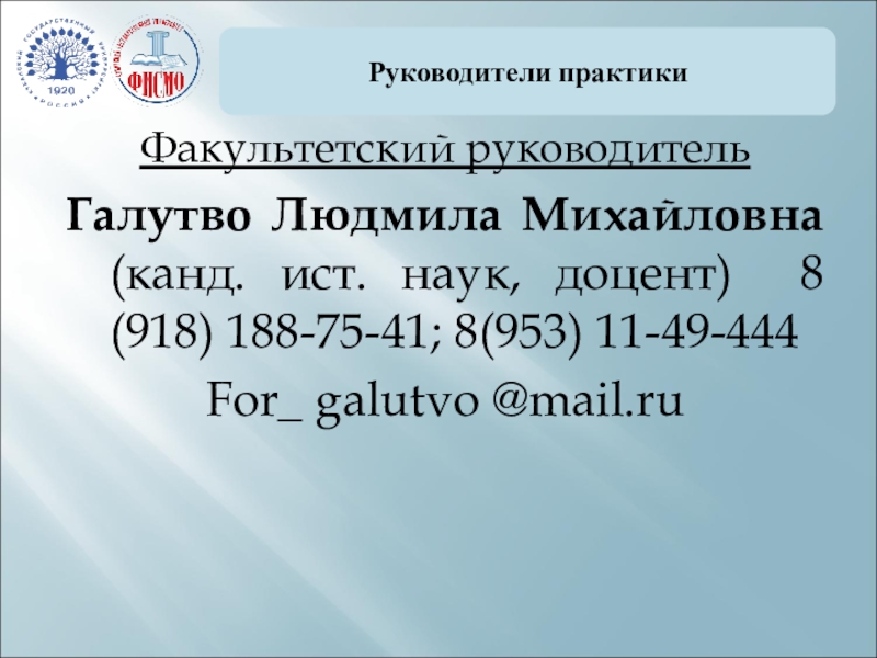Групповой руководитель практики – Галутво Людмила Михайловна (канд. ист. наук, доцент) 8 (918)-188-75-41;