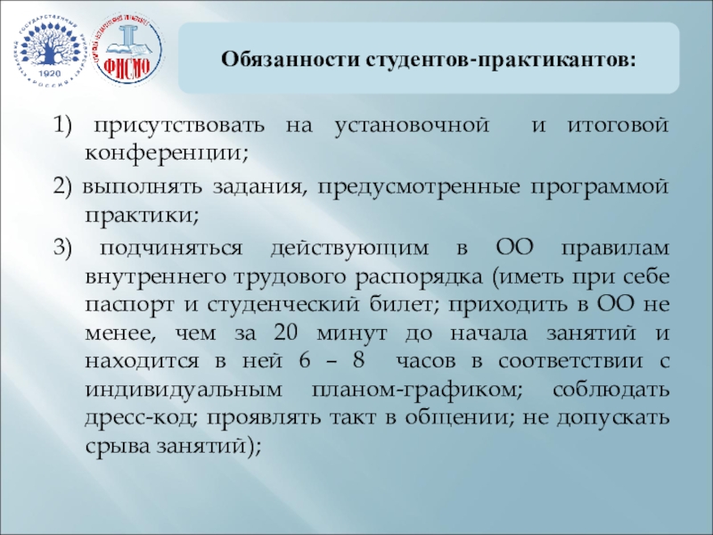 распорядка (иметь при себе паспорт и студенческий билет; приходить в ОО не менее, чем за 20 минут до начала занятий и находится в ней 6 – 8 часов в соответствии с индивидуальным планом-графиком; соблюдать дресс-код; проявлять такт в общении; не допускать срыва занятий);