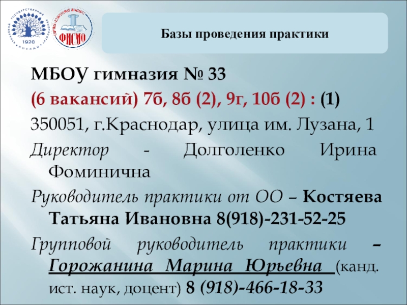 Групповой руководитель практики – Горожанина Марина Юрьевна (канд. ист. наук, доцент) 8 (918)-466-18-33