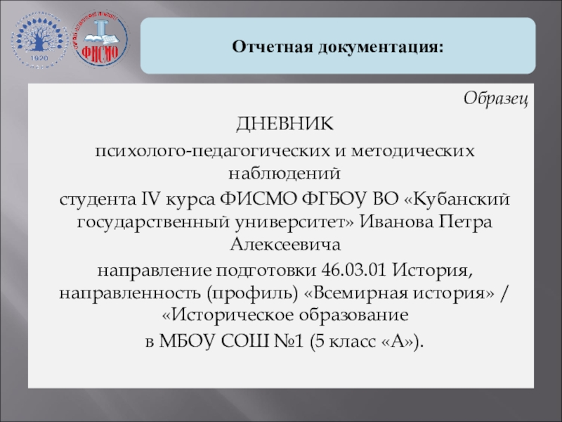 дня (с указанием тематики занятий и мероприятий), анализ проделанного, психолого-педагогические и методические наблюдения, необходимые для выполнения заданий по практике. Титульный лист оформляется по образцу. Ежедневные наблюдения фиксируются в свободной форме в соответствии с индивидуальным планом-графиком каждого студента.