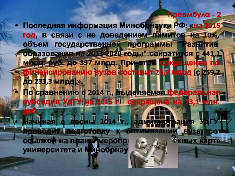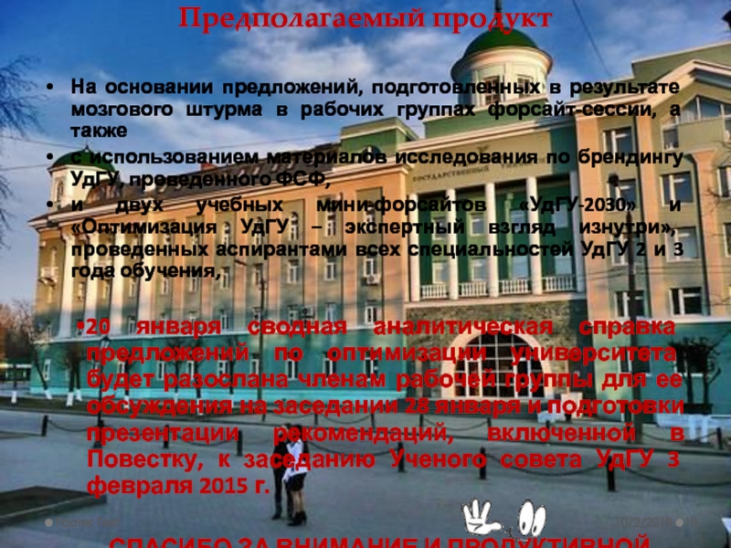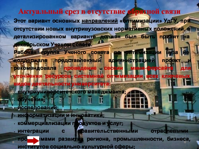 3. Определить ресурсы системной оптимизации по ключевым направлениям деятельности университета (см. анонс) как образовательно-исследовательского центра региона и возможности приращения внебюджета. Время слайдовой презентации группы – 10-12 мин. Время работы в группах – 2 часа, до кофе-брейка в 14:30.