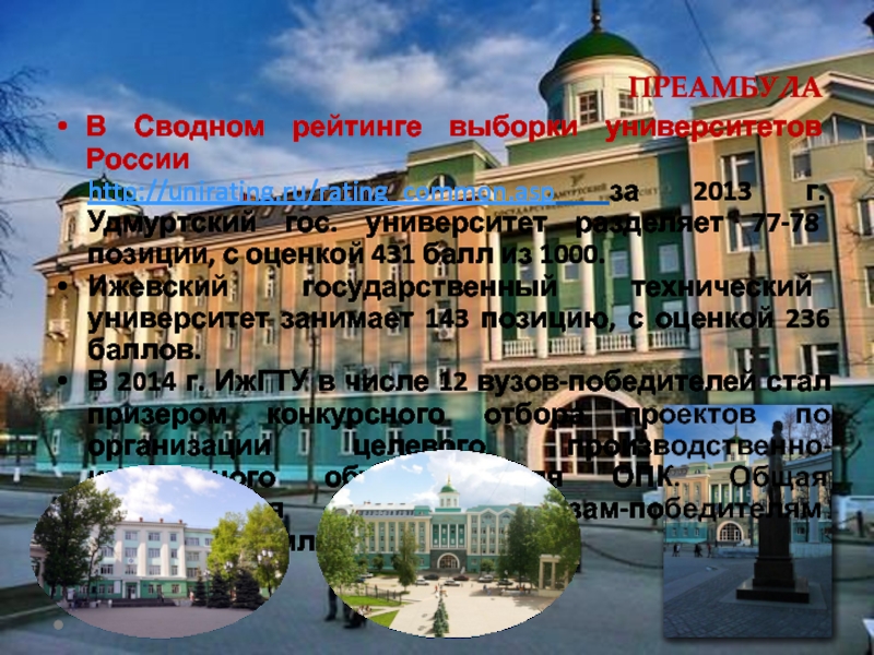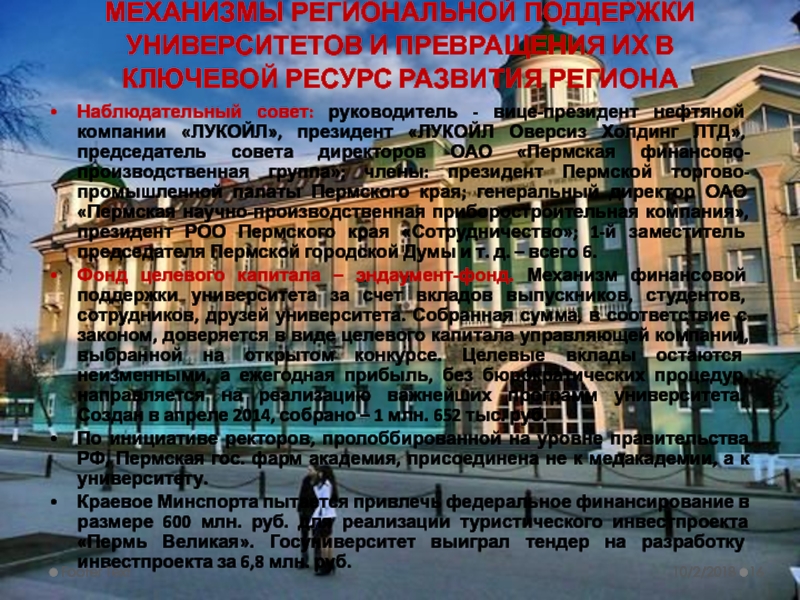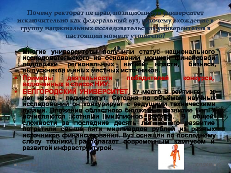 БЕЛГОРОДСКИЙ УНИВЕРСИТЕТ, 37 место в рейтинге – 10 лет назад - пединститут. Сегодня по объёмам научных исследований он конкурирует с ведущими техническими вузами. Вложения областного бюджета в развитие БелГУ исчисляются сотнями миллионов рублей. В общей сложности за последние десять лет на его развитие потратили свыше пяти миллиардов рублей из разных источников финансирования. Вуз оснащён по последнему слову техники, располагает современным кампусом и развитой инфраструктурой.