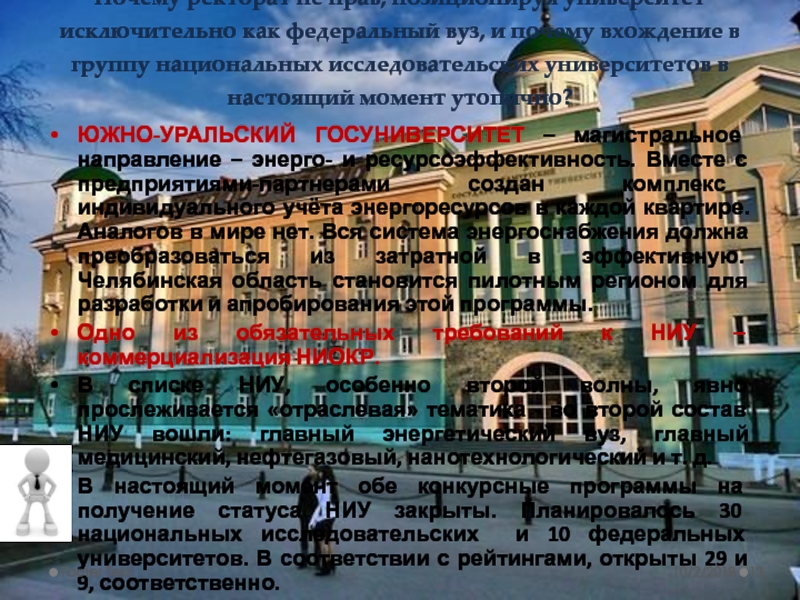 ЮЖНО-УРАЛЬСКИЙ ГОСУНИВЕРСИТЕТ – магистральное направление – энерго- и ресурсоэффективность. Вместе с предприятиями-партнерами создан комплекс индивидуального учёта энергоресурсов в каждой квартире. Аналогов в мире нет. Вся система энергоснабжения должна преобразоваться из затратной в эффективную. Челябинская область становится пилотным регионом для разработки и апробирования этой программы.