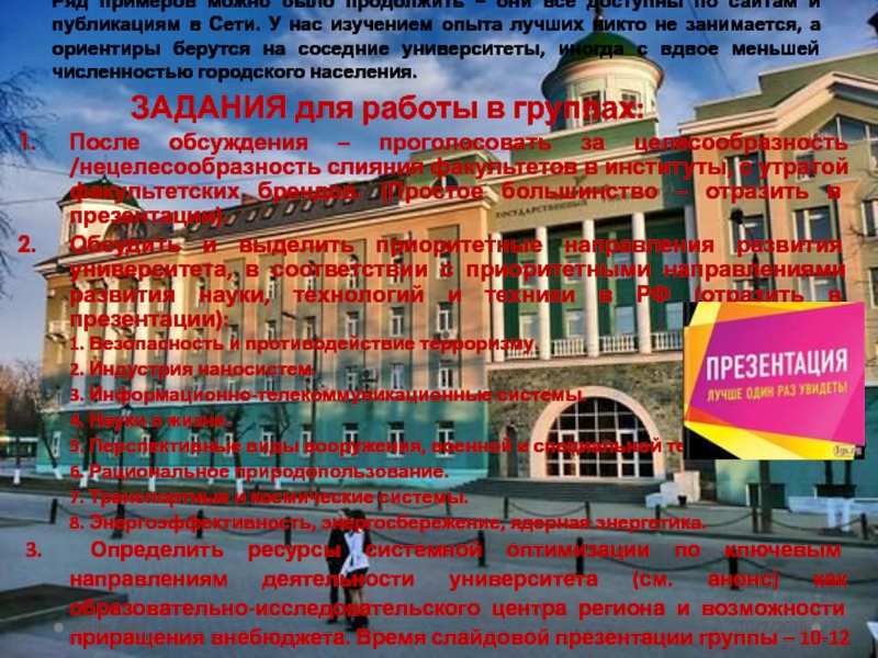 Обсудить и выделить приоритетные направления развития университета, в соответствии с приоритетными направлениями развития науки, технологий и техники в РФ (отразить в презентации):