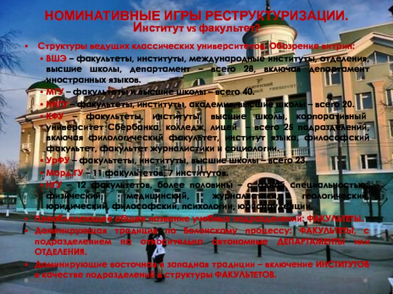 В списке НИУ, особенно второй волны, явно прослеживается «отраслевая» тематика - во второй состав НИУ вошли: главный энергетический вуз, главный медицинский, нефтегазовый, нанотехнологический и т. д.