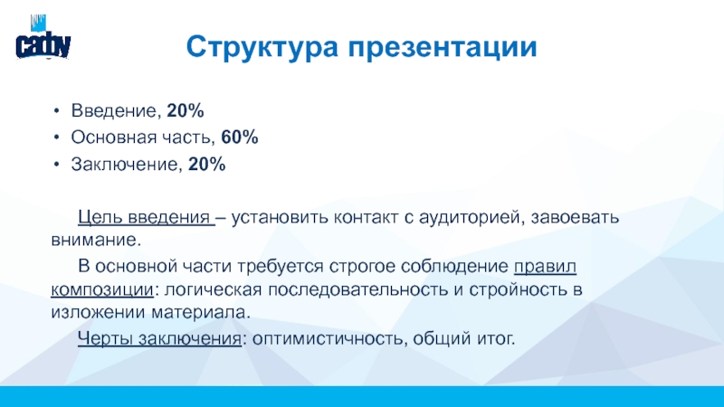 Структура презентацииВведение, 20%Основная часть, 60%Заключение, 20%	Цель введения – установить контакт с аудиторией, завоевать внимание.	В основной части требуется
