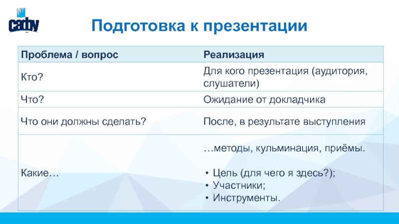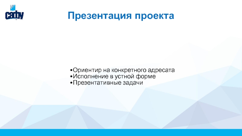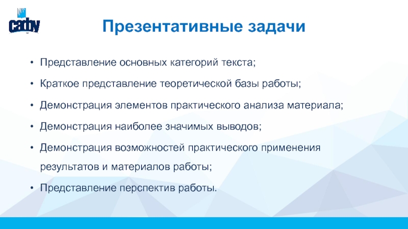 Презентативные задачиПредставление основных категорий текста;Краткое представление теоретической базы работы;Демонстрация элементов практического анализа материала; Демонстрация наиболее значимых выводов;Демонстрация