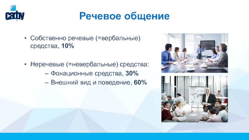 Речевое общениеСобственно речевые (=вербальные) средства, 10%Неречевые (=невербальные) средства:Фонационные средства, 30%Внешний вид и поведение, 60%