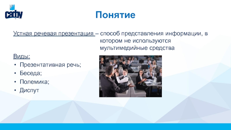 ПонятиеУстная речевая презентация – способ представления информации, в котором не используются мультимедийные средстваВиды:Презентативная речь;Беседа;Полемика;Диспут