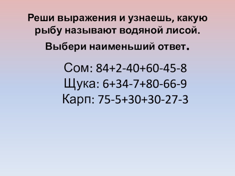 Слайд 7Реши выражения и узнаешь, какую рыбу называют водяной лисой. Выбери