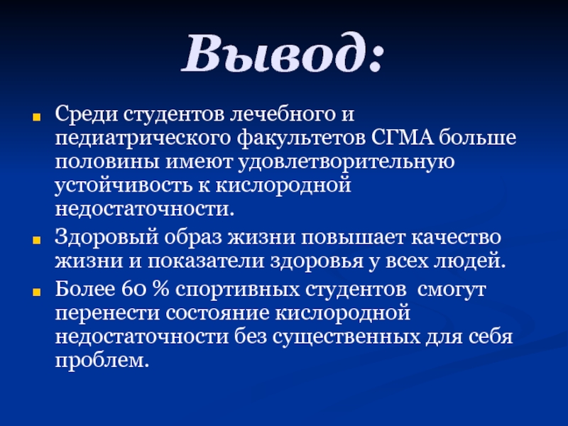 Вывод:Среди студентов лечебного и педиатрического факультетов СГМА больше половины имеют удовлетворительную устойчивость к кислородной недостаточности.Здоровый образ жизни