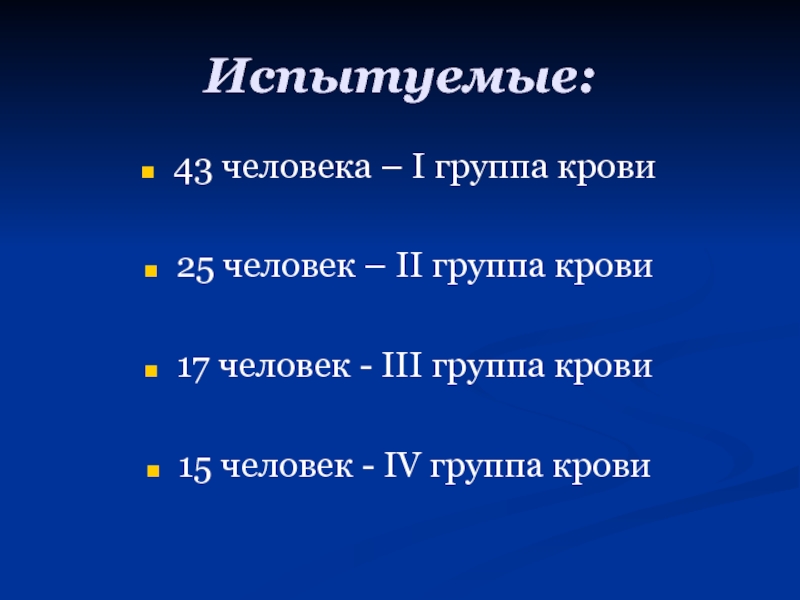 Испытуемые:43 человека – I группа крови25 человек – II группа крови17 человек - III группа крови15 человек