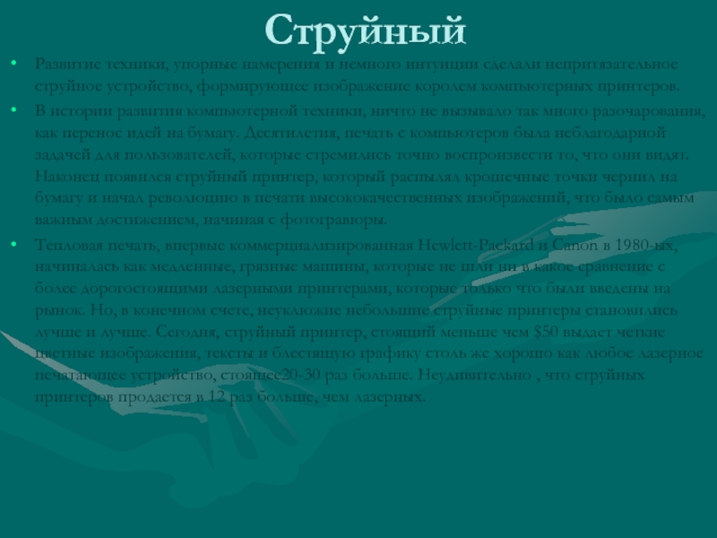 ничто не вызывало так много разочарования, как перенос идей на бумагу. Десятилетия, печать с компьютеров была неблагодарной задачей для пользователей, которые стремились точно воспроизвести то, что они видят. Наконец появился струйный принтер, который распылял крошечные точки чернил на бумагу и начал революцию в печати высококачественных изображений, что было самым важным достижением, начиная с фотогравюры.