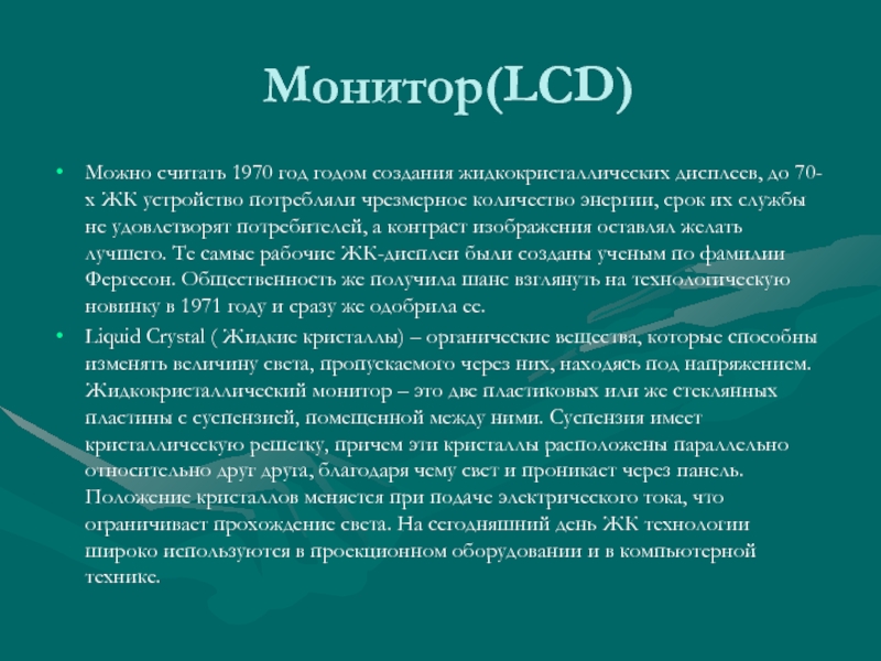 Жидкокристаллический монитор – это две пластиковых или же стеклянных пластины с суспензией, помещенной между ними. Суспензия имеет кристаллическую решетку, причем эти кристаллы расположены параллельно относительно друг друга, благодаря чему свет и проникает через панель. Положение кристаллов меняется при подаче электрического тока, что ограничивает прохождение света. На сегодняшний день ЖК технологии широко используются в проекционном оборудовании и в компьютерной технике.