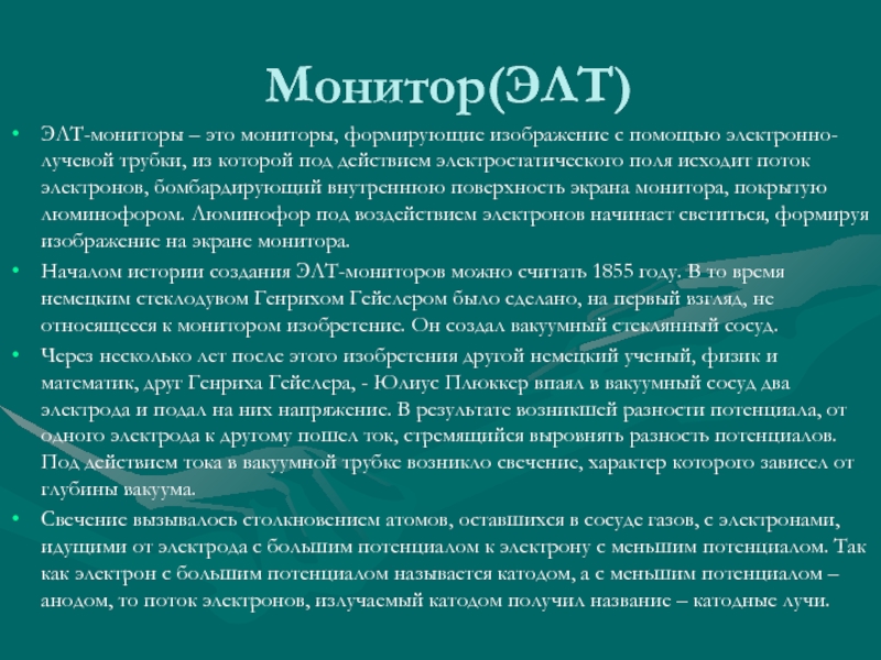 ЭЛТ-мониторы – это мониторы, формирующие изображение с помощью электронно-лучевой трубки,