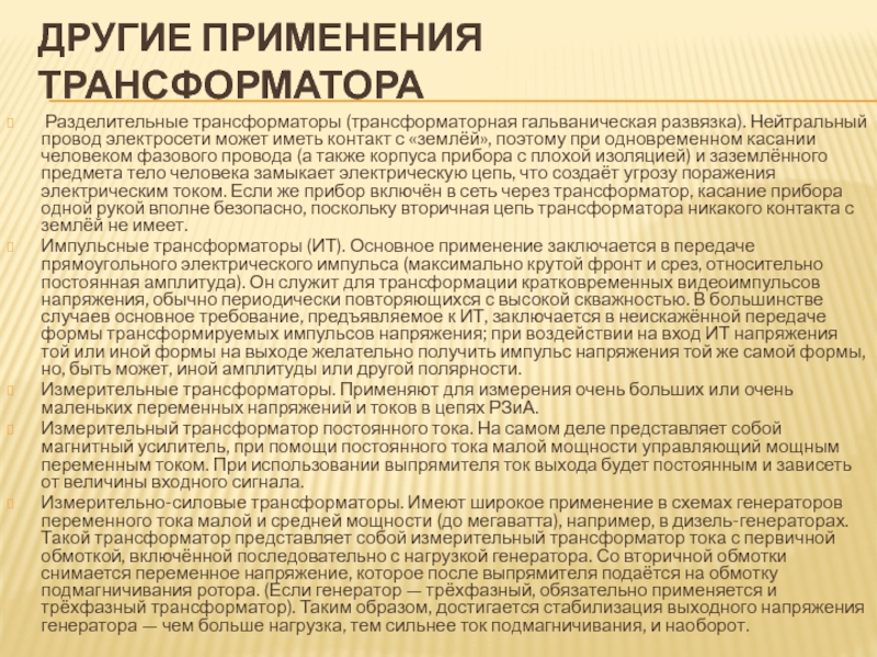 человеком фазового провода (а также корпуса прибора с плохой изоляцией) и заземлённого предмета тело человека замыкает электрическую цепь, что создаёт угрозу поражения электрическим током. Если же прибор включён в сеть через трансформатор, касание прибора одной рукой вполне безопасно, поскольку вторичная цепь трансформатора никакого контакта с землёй не имеет.