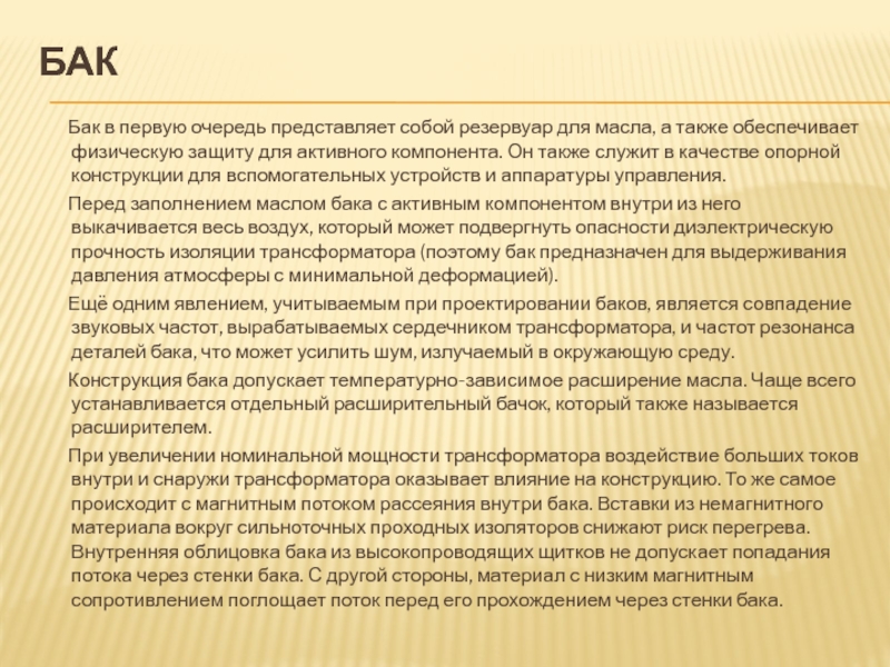 Конструкция бака допускает температурно-зависимое расширение масла. Чаще всего устанавливается отдельный расширительный бачок, который также называется расширителем.