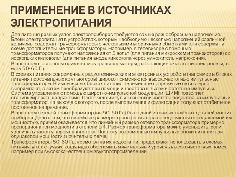 В прошлом сетевой трансформатор (на 50-60 Гц) был одной из самых тяжёлых деталей многих приборов. Дело в том, что линейные размеры трансформатора определяются передаваемой им мощностью, причём оказывается, что линейный размер сетевого трансформатора примерно пропорционален мощности в степени 1/4. Размер трансформатора можно уменьшить, если увеличить частоту переменного тока. Поэтому современные импульсные блоки питания при одинаковой мощности значительно легче.
