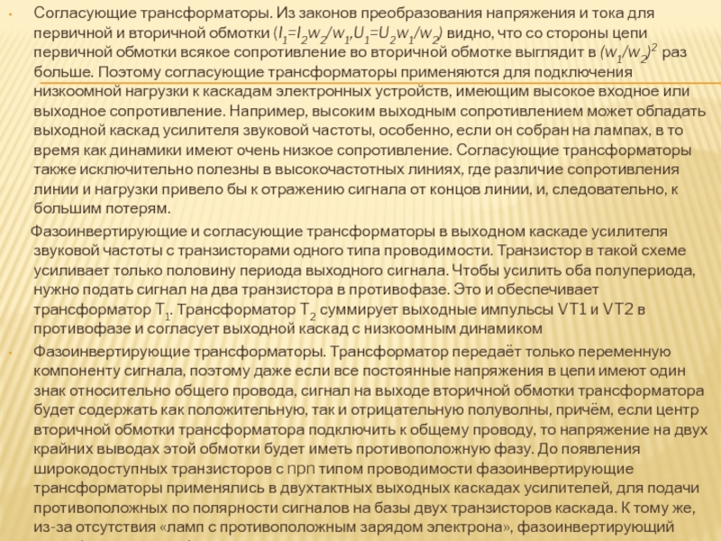 Фазоинвертирующие и согласующие трансформаторы в выходном каскаде усилителя звуковой частоты с транзисторами одного типа проводимости. Транзистор в такой схеме усиливает только половину периода выходного сигнала. Чтобы усилить оба полупериода, нужно подать сигнал на два транзистора в противофазе. Это и обеспечивает трансформатор T1. Трансформатор T2 суммирует выходные импульсы VT1 и VT2 в противофазе и согласует выходной каскад с низкоомным динамиком