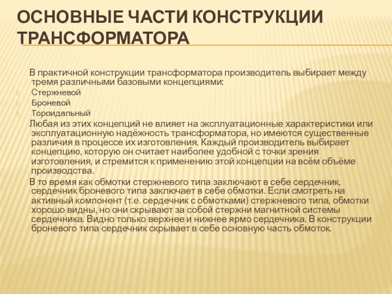 из этих концепций не влияет на эксплуатационные характеристики или эксплуатационную надёжность трансформатора, но имеются существенные различия в процессе их изготовления. Каждый производитель выбирает концепцию, которую он считает наиболее удобной с точки зрения изготовления, и стремится к применению этой концепции на всём объёме производства.