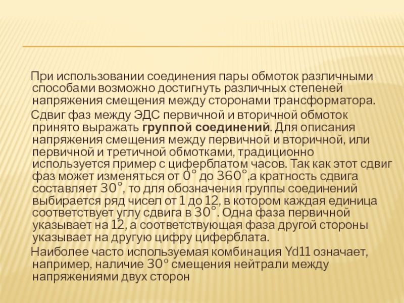 Наиболее часто используемая комбинация Yd11 означает, например, наличие 30º смещения нейтрали между напряжениями двух сторон