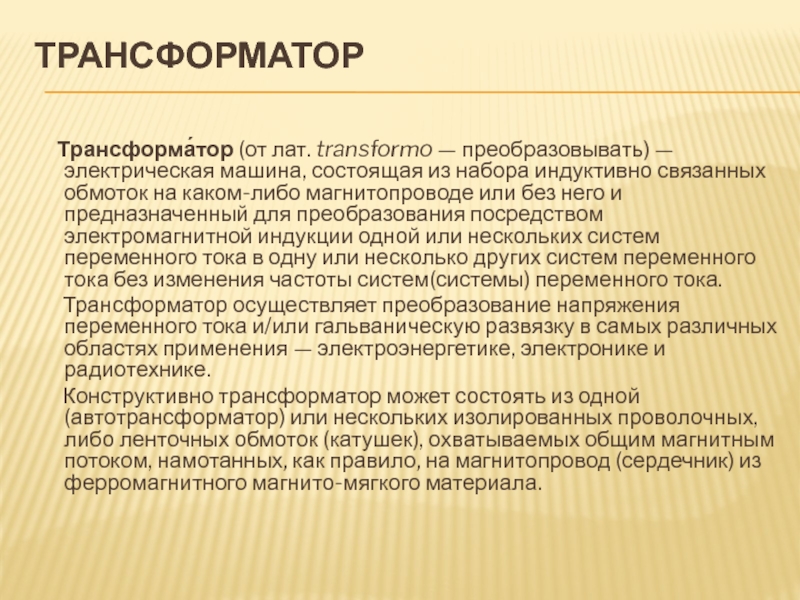 Трансформа́тор (от лат. transformo — преобразовывать) — электрическая машина, состоящая