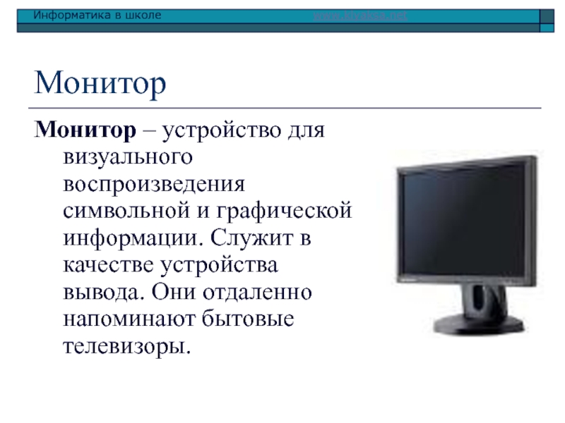 Монитор – устройство для визуального воспроизведения символьной и графической информации.