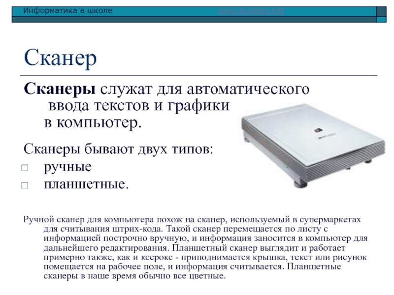 сканер, используемый в супермаркетах для считывания штрих-кода. Такой сканер перемещается по листу с информацией построчно вручную, и информация заносится в компьютер для дальнейшего редактирования. Планшетный сканер выглядит и работает примерно также, как и ксерокс - приподнимается крышка, текст или рисунок помещается на рабочее поле, и информация считывается. Планшетные сканеры в наше время обычно все цветные.